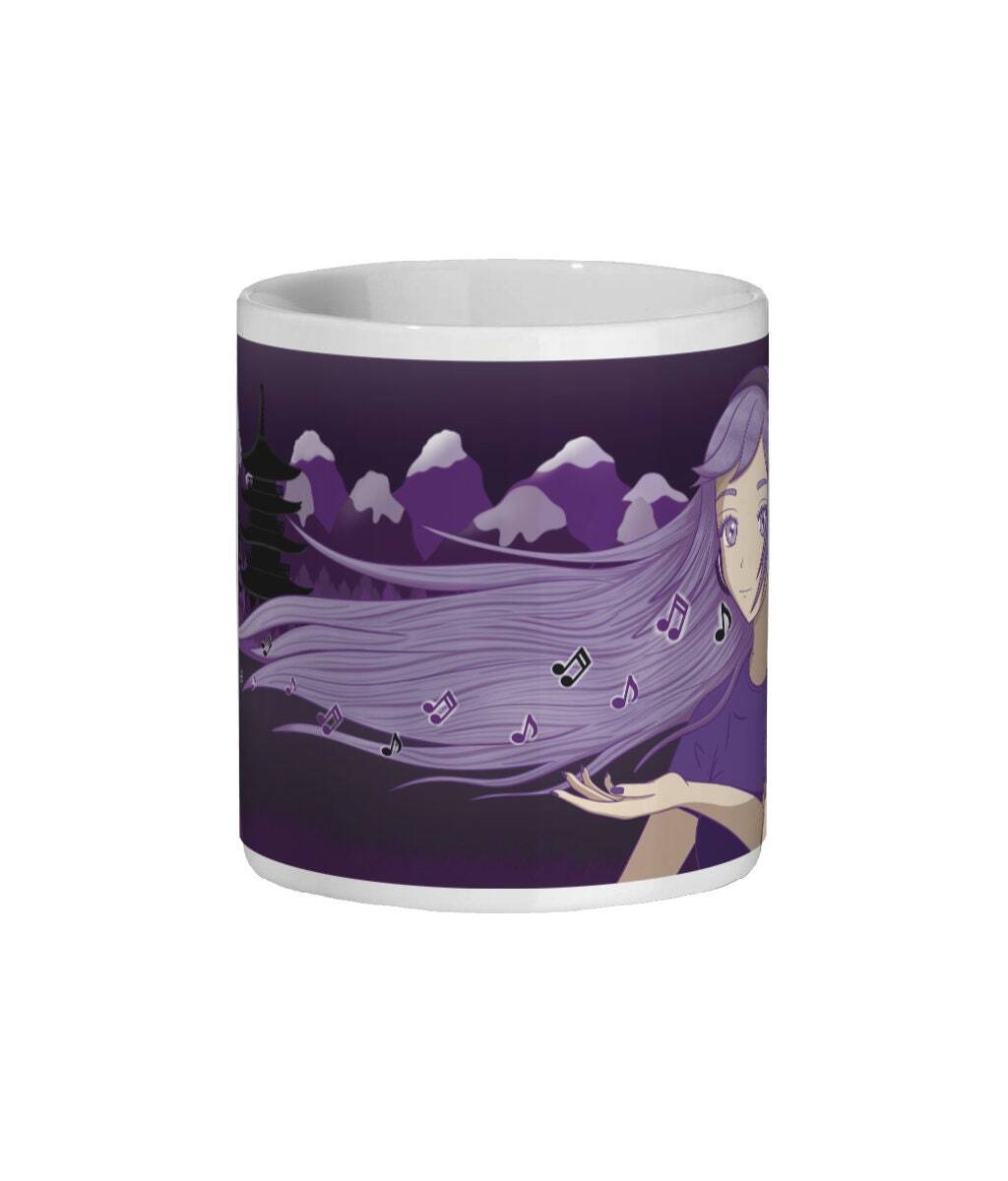 This is a white 11oz ceramic mug with a purple anime girl graphic design.