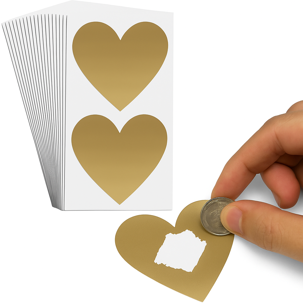 Add a touch of fun and surprise to your creations with these large gold heart scratch-off stickers. Each 7x8cm heart is easy to apply simply write or print your hidden message on a card, then place the scratch sticker over it. When scratched, your message or prize is revealed in seconds!