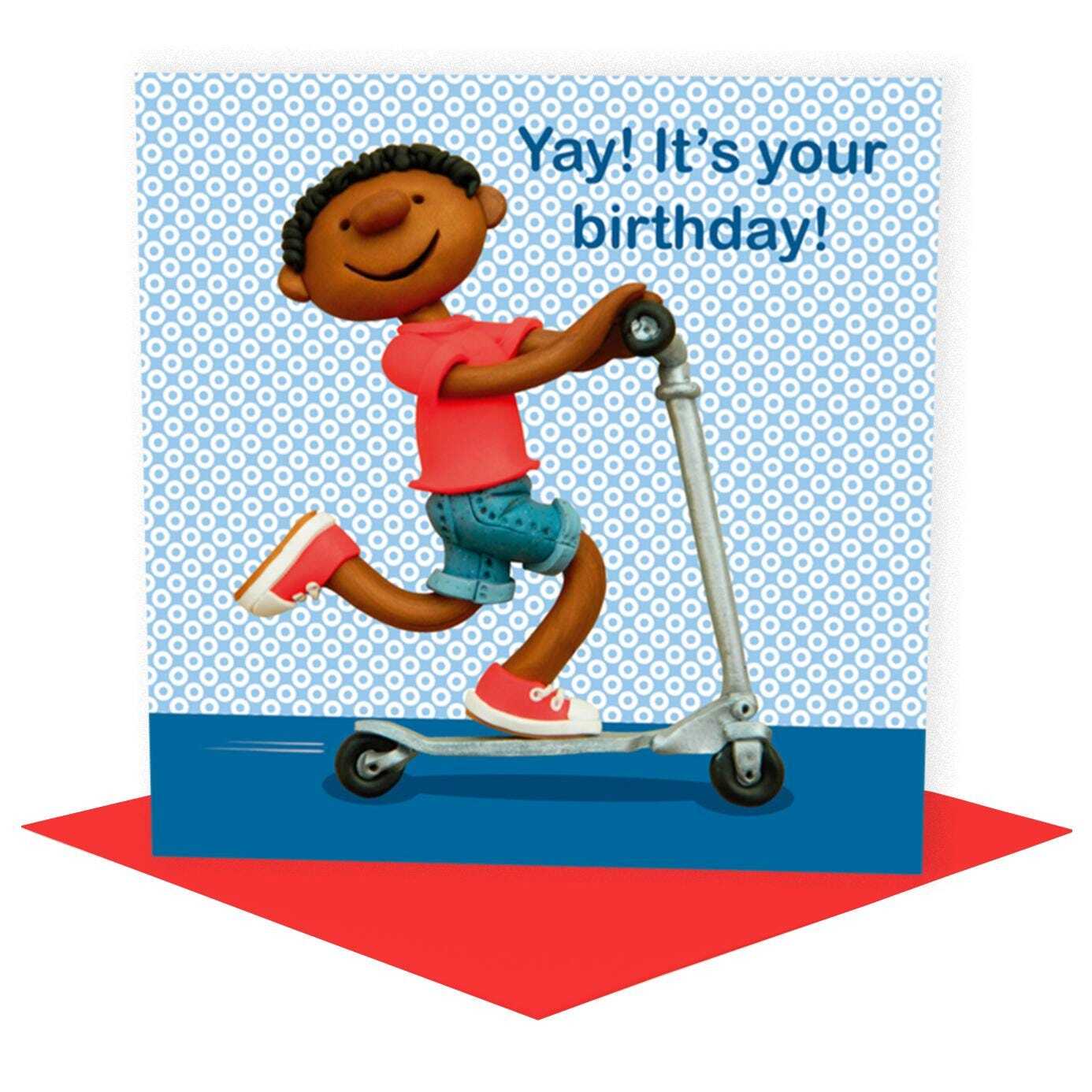 A beautiful birthday card to celebrate a little boy's special birthday, designed by artist Erica Sturla and featuring one of her signature polymer clay characters - a little boy on his scooter. Part of Erica's Ferdie and Friends range of children's cards, which includes ages 1 to 10, general kids birthdays and also child-friendly occasions cards including thank you and get well soon cards. This lovely design is great on its own or to accompany your birthday gifts. With her amazing sculpture skills Erica breathes life into her polymer clay characters, she then photographs them and they are printed onto fabulous 300gsm board. They come with a bright and cheerful colour matched envelope. To protect the card and envelope they come wrapped in a Nativia clear corn-starch bag. All Holy Mackerel cards are designed by our amazing British artists and are made right here in the UK. This card measures 15cm square when folded and so is suitable for Royal Mail standard letter post. It is blank inside with a matt inner surface suitable for writing on with most pen types.