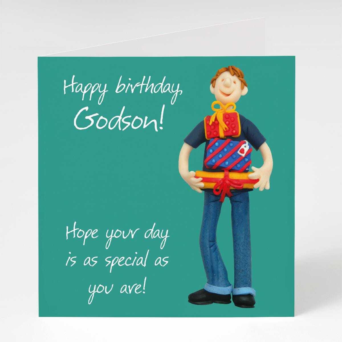 A bright and fun birthday card for a Godson to celebrate that special milestone, designed by artist Erica Sturla and featuring her signature polymer clay characters. Part of Erica's One Lump or Two range of relations cards for women and men, from granddaughter and grandson birthday cards, to aunts, uncles, and beyond! This lovely God-son design is great on its own or to accompany your birthday gifts. With her amazing sculpture skills Erica breathes life into her polymer clay characters, she then photographs them and they are printed onto fabulous 300gsm board. They come with a heavyweight white laid envelope. To protect the card and envelope they come wrapped in a Nativia clear corn-starch bag. All Holy Mackerel cards are designed by our amazing British artists and are made right here in the UK. This card measures 15cm square when folded and so is suitable for Royal Mail standard letter post. It is blank inside with a matt inner surface suitable for writing on with most pen types.