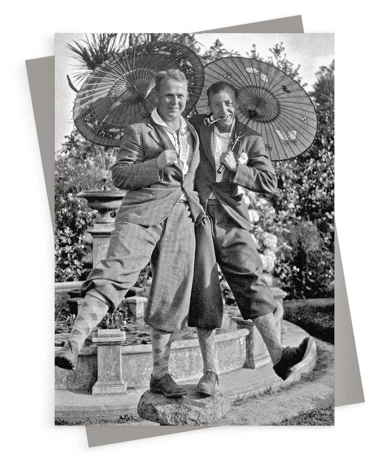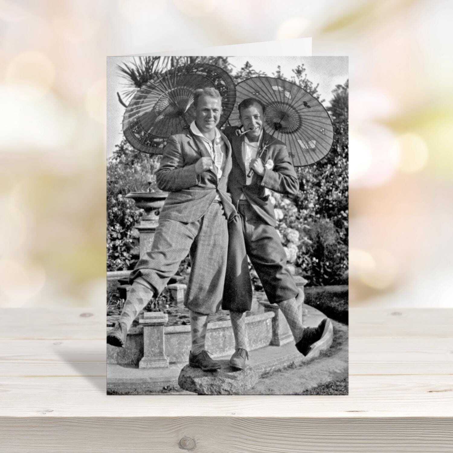 Throwing shade, retro photographic card featuring 1920s fashionable gay men with umbrellas - 12.6 x 17.7cm and blank inside - made in the UK
