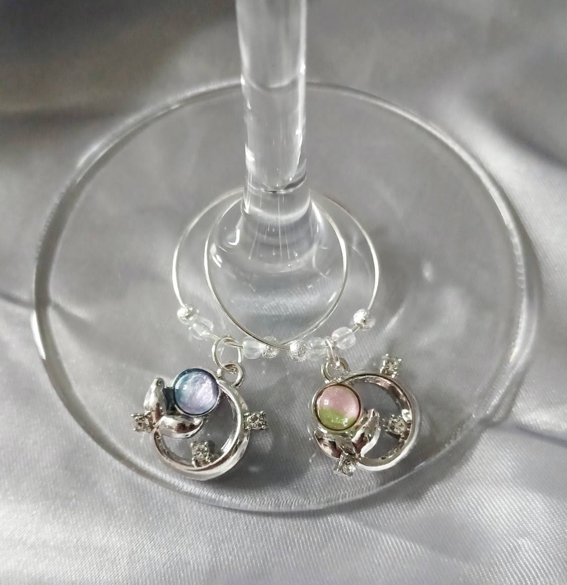 These gorgeous and unique wine glass charms portray mermaid tails in the moonlight, with an opalescent moon in shades of different colours with added cubic zirconia.