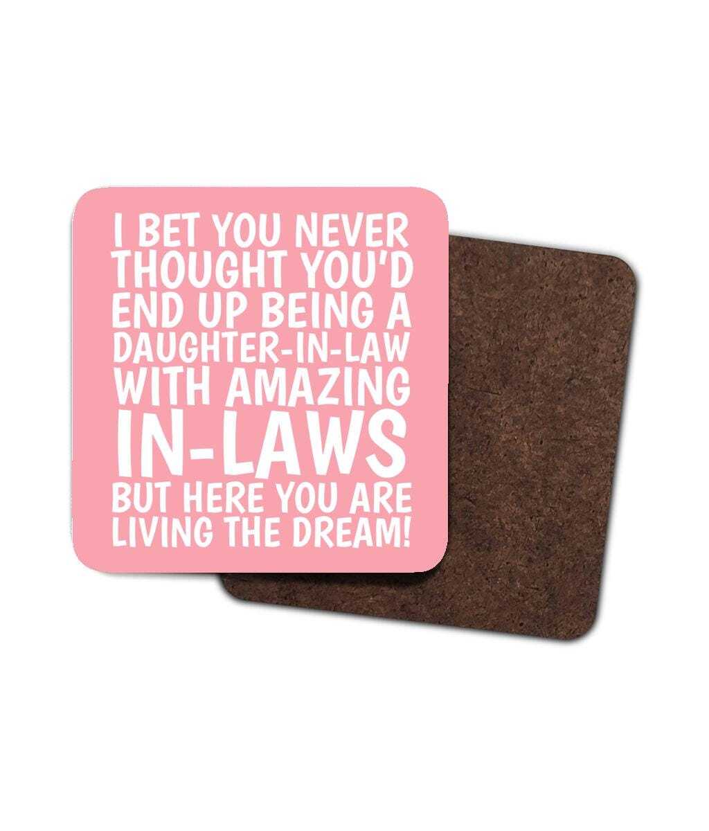 This funny coaster features a funny phrase “I bet you never thought you'd end up being a Daughter-In-Law with amazing In-Laws but here you are living the dream!” Ideal for a birthday or any occasion you like, this coaster is sure to make her laugh out loud. Also available from Mother-In-Law or Father-In-Law.