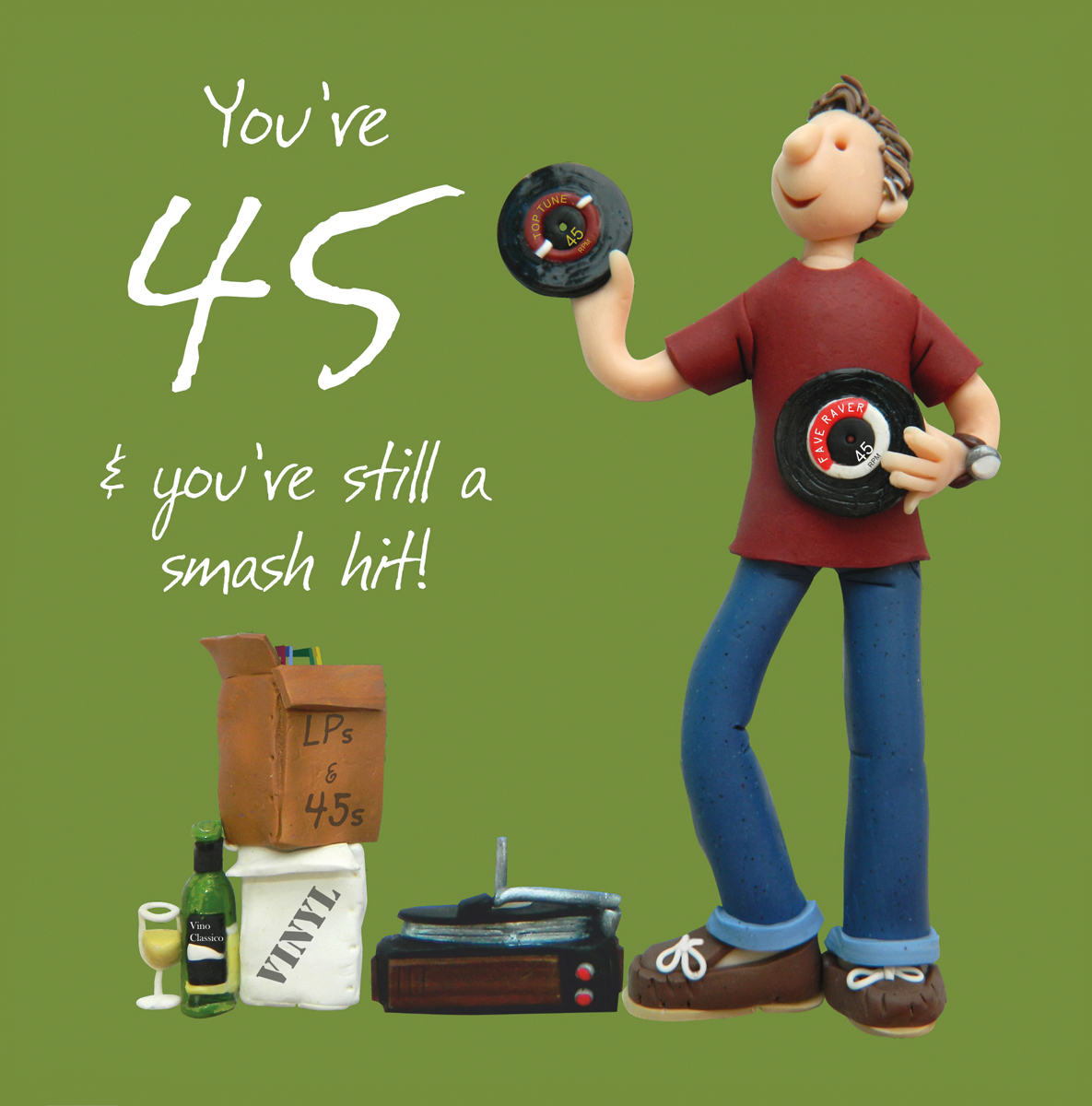 Holy Mackerel forty five and a smash hit male 45th birthday card for him - designed by artist Erica Sturla - 15cm square and blank inside for your message - made in the UK