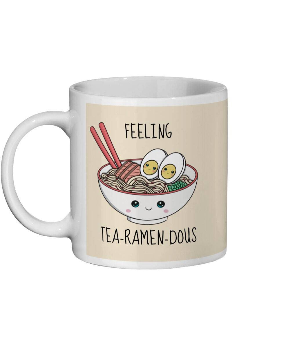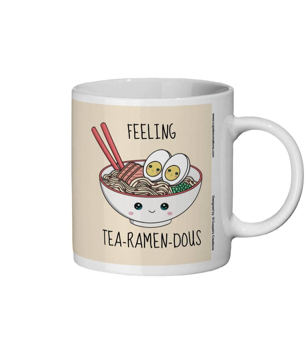 This is a white 11oz ceramic mug with a cute ramen noodle bowl graphic design and the text "Feeling tea-ramen-dous"