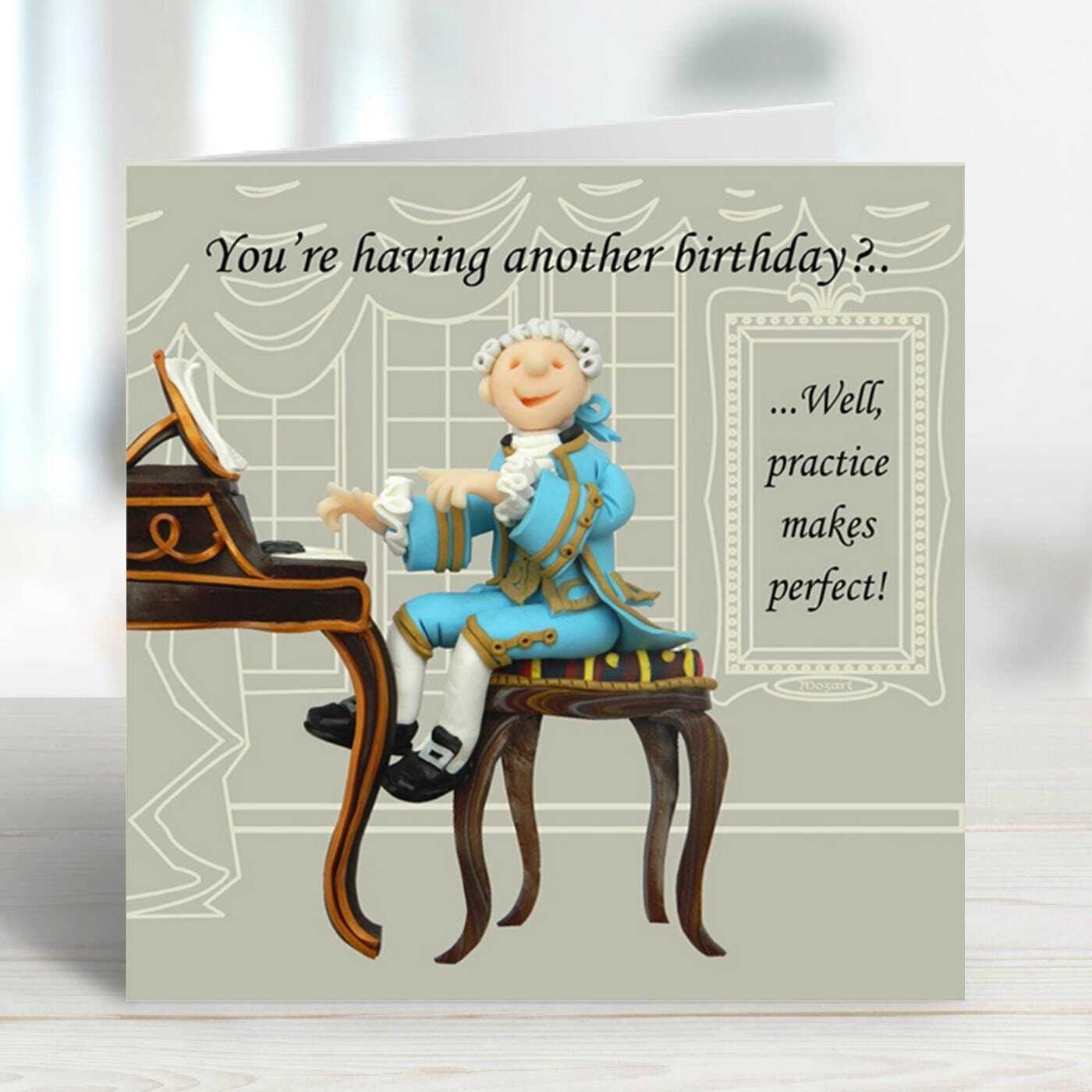 Practice makes perfect - Mozart themed birthday card - designed by Erica Sturla - 15cm square and blank inside, made in the UK