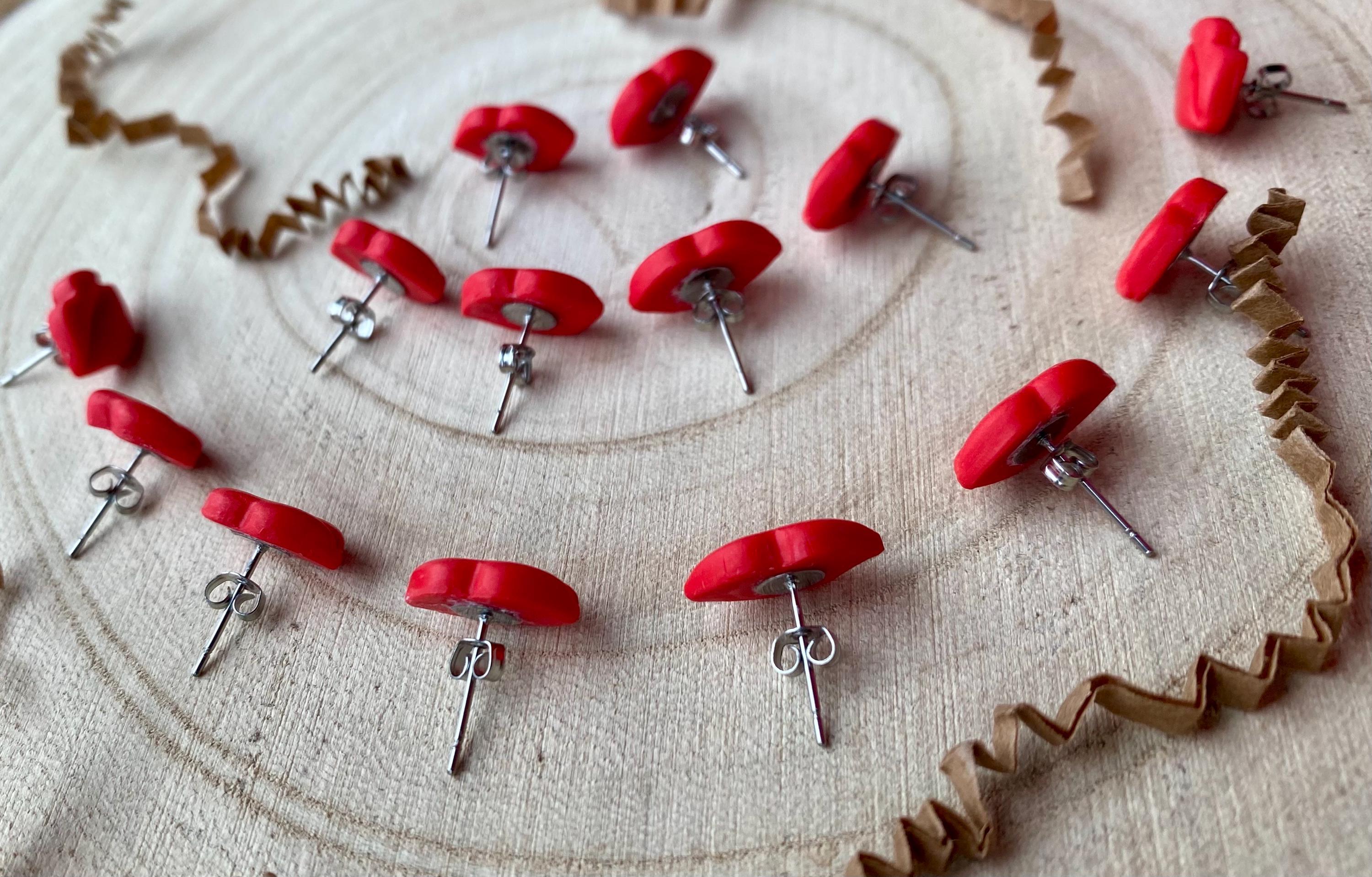 Handmade bold red clay lip studs, with hypoallergenic backs. A simple design to wear ready every day to brighten your day and make a bold statement and sharing the love!