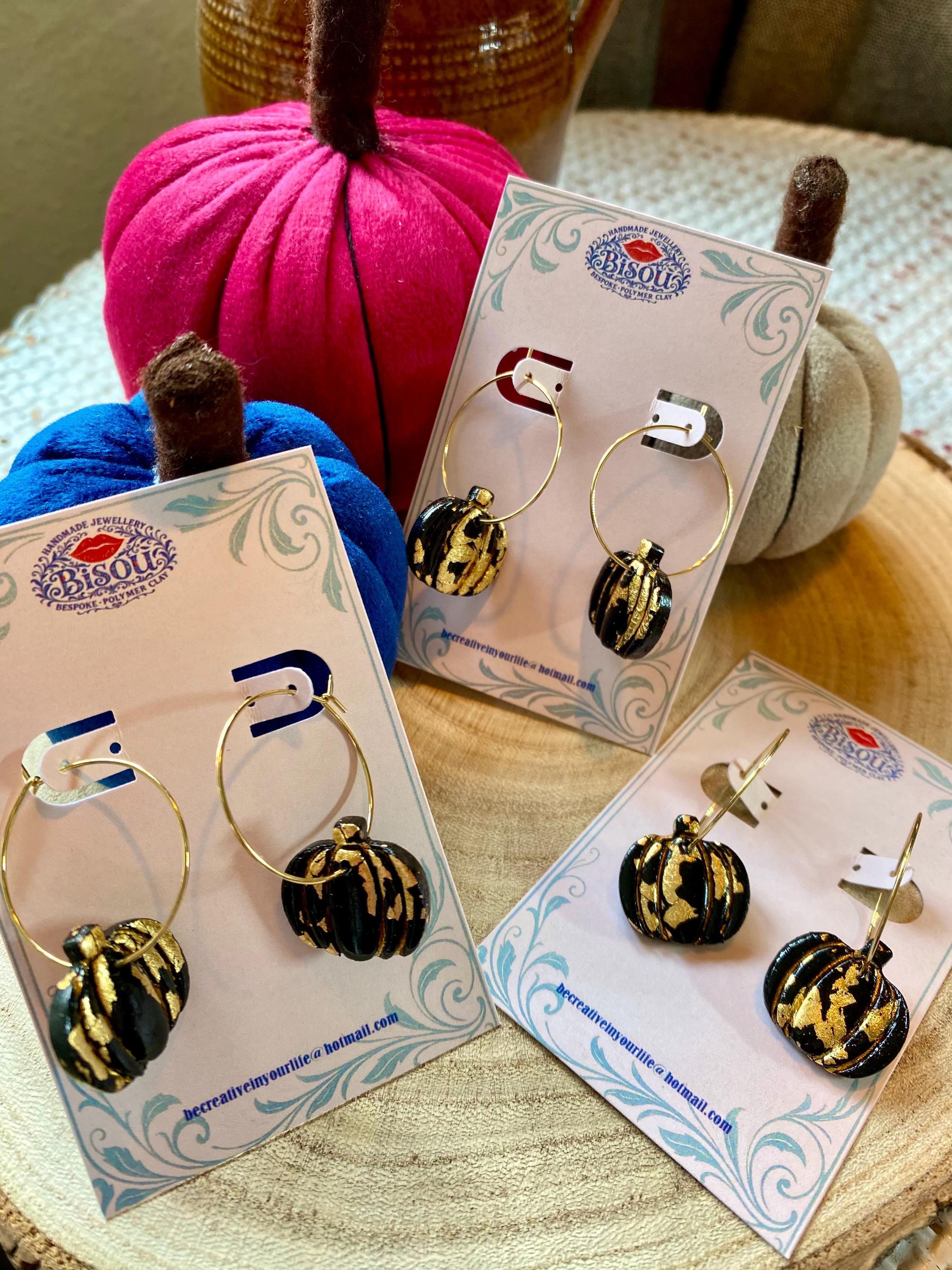 Add a touch of autumn elegance with these stunning gold and black pumpkin hoop earrings, handmade from polymer clay and finished with shimmering gold leaf detailing.