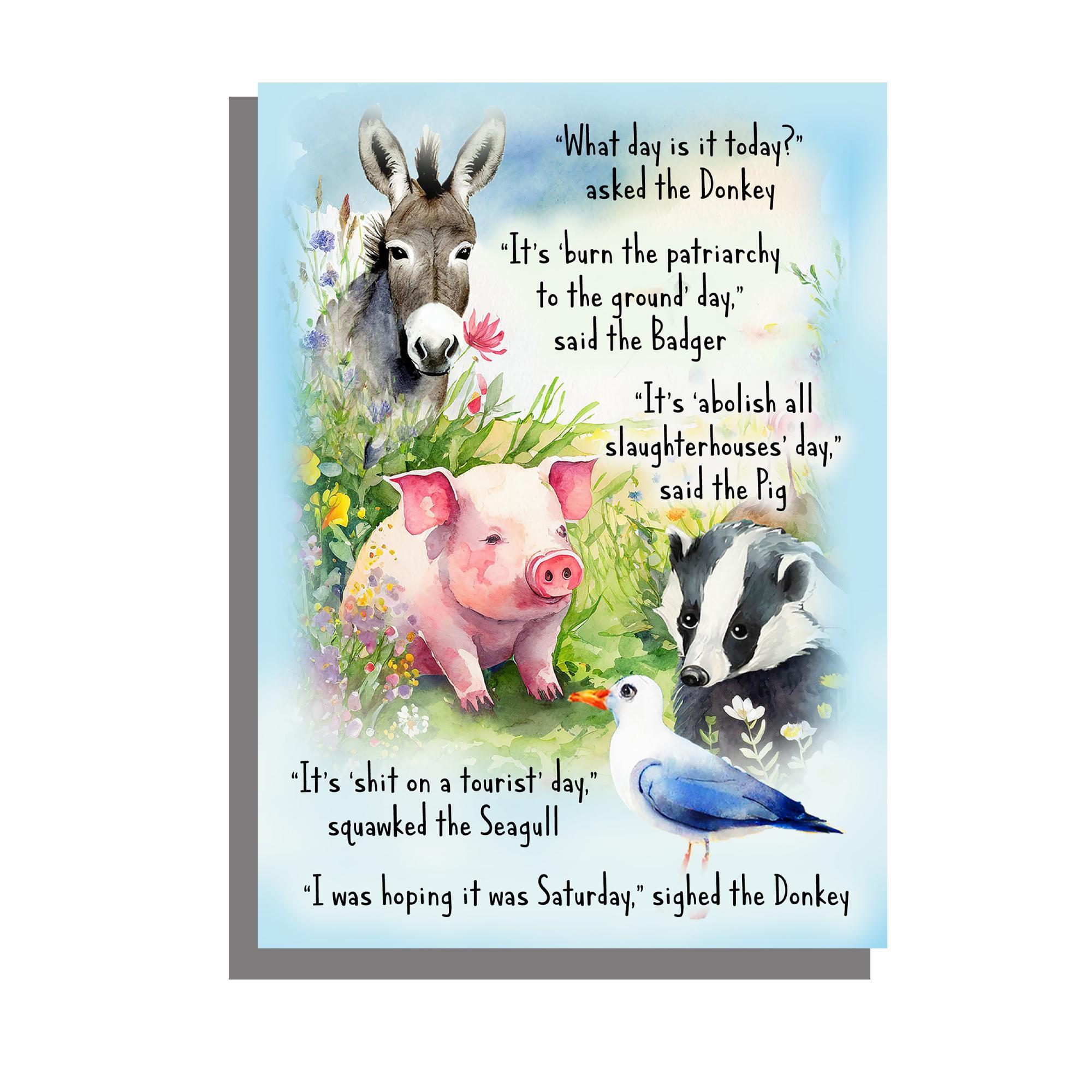 Funny What Day? Birthday Card pig donkey seagull badger A5 uncoated textured
