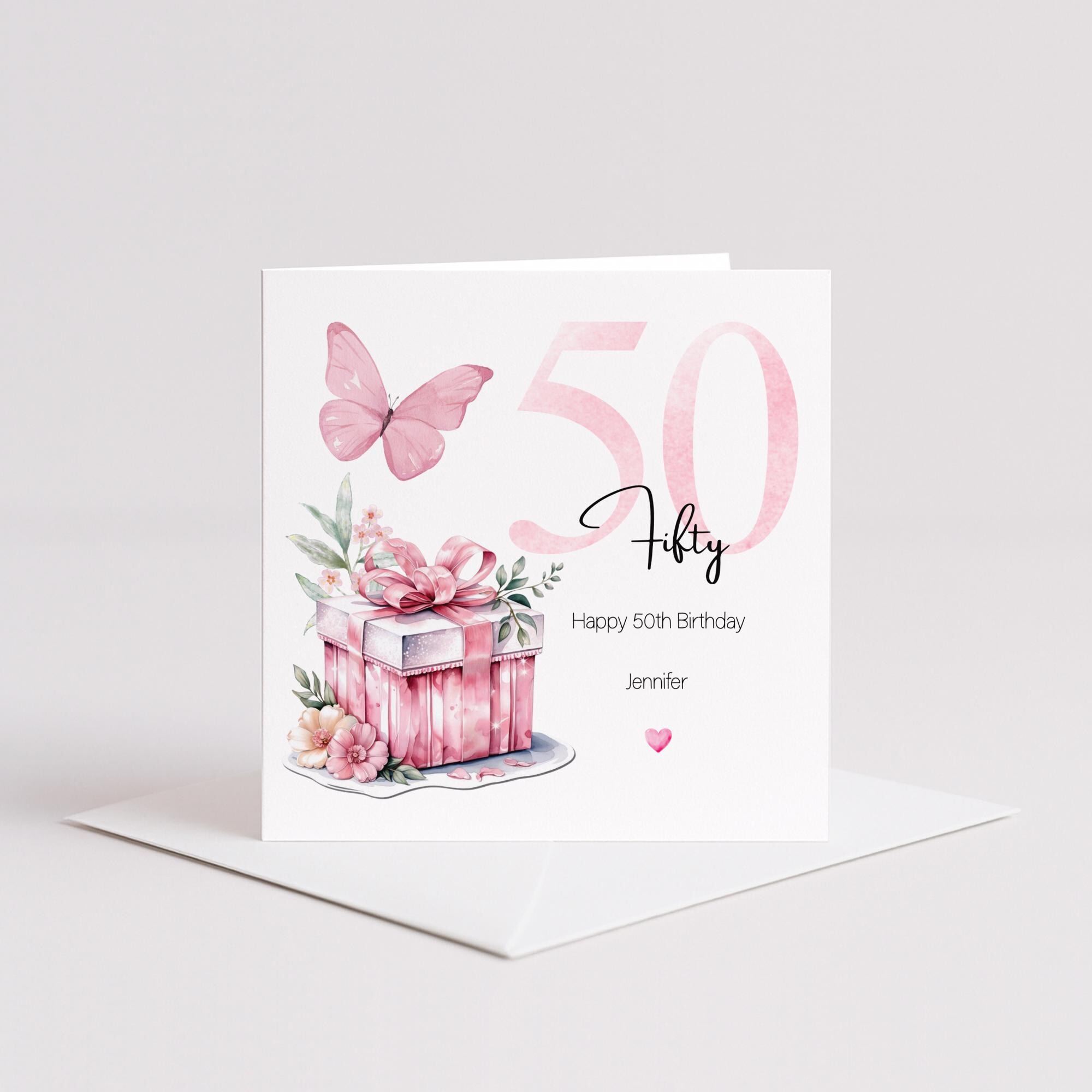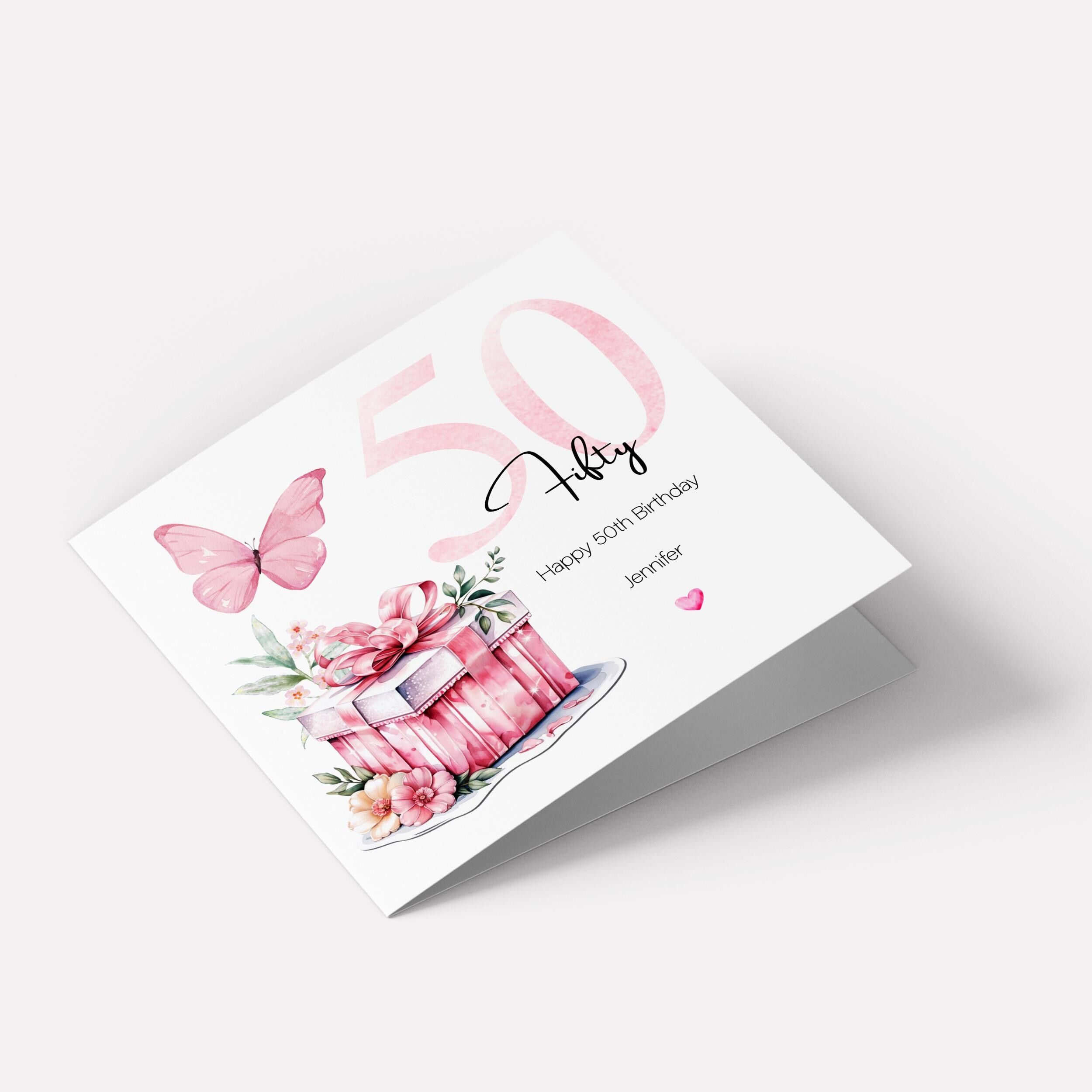 Personalised 50th Birthday Card for Her Pink Butterfly, Gift Box & Flowers Milestone Greeting Womens