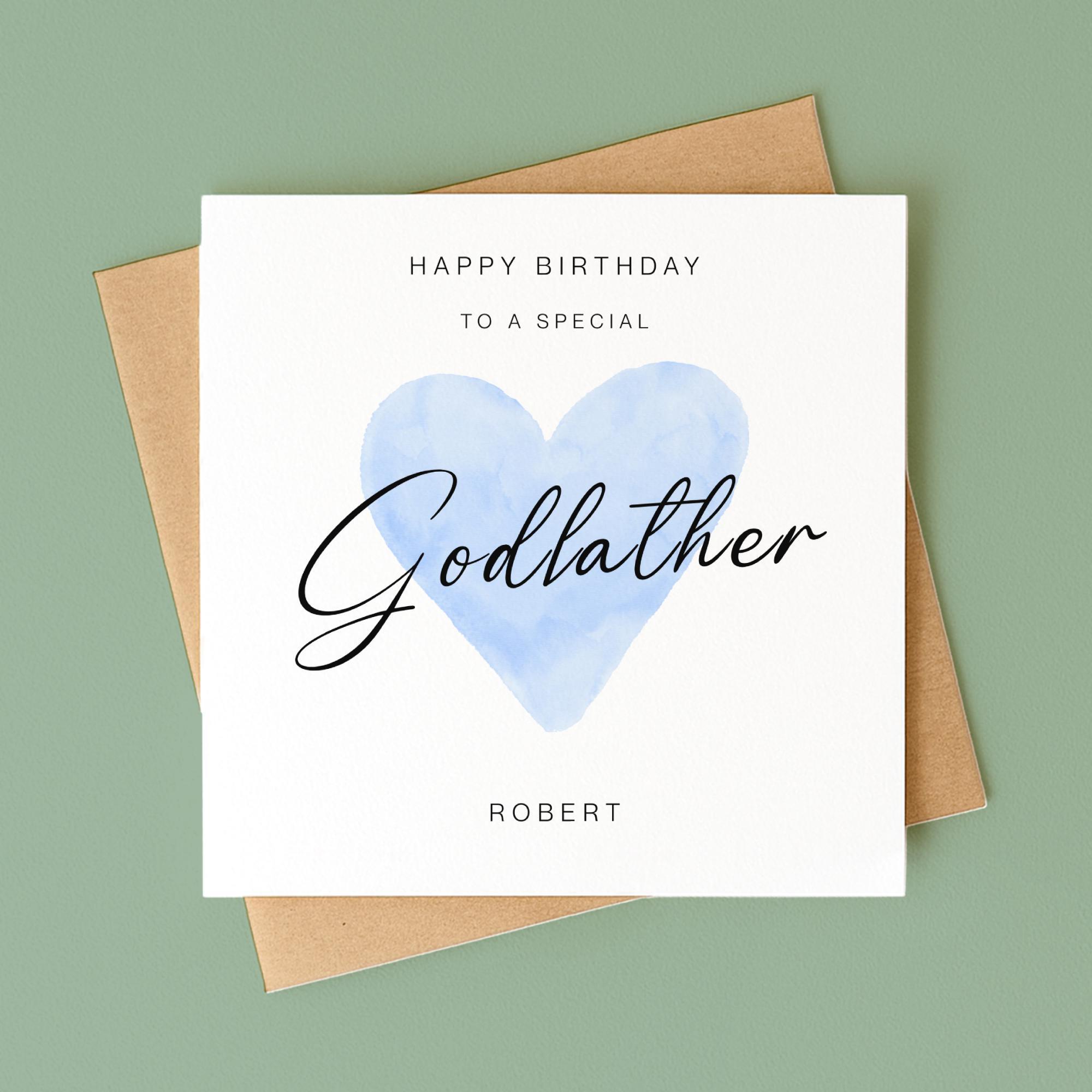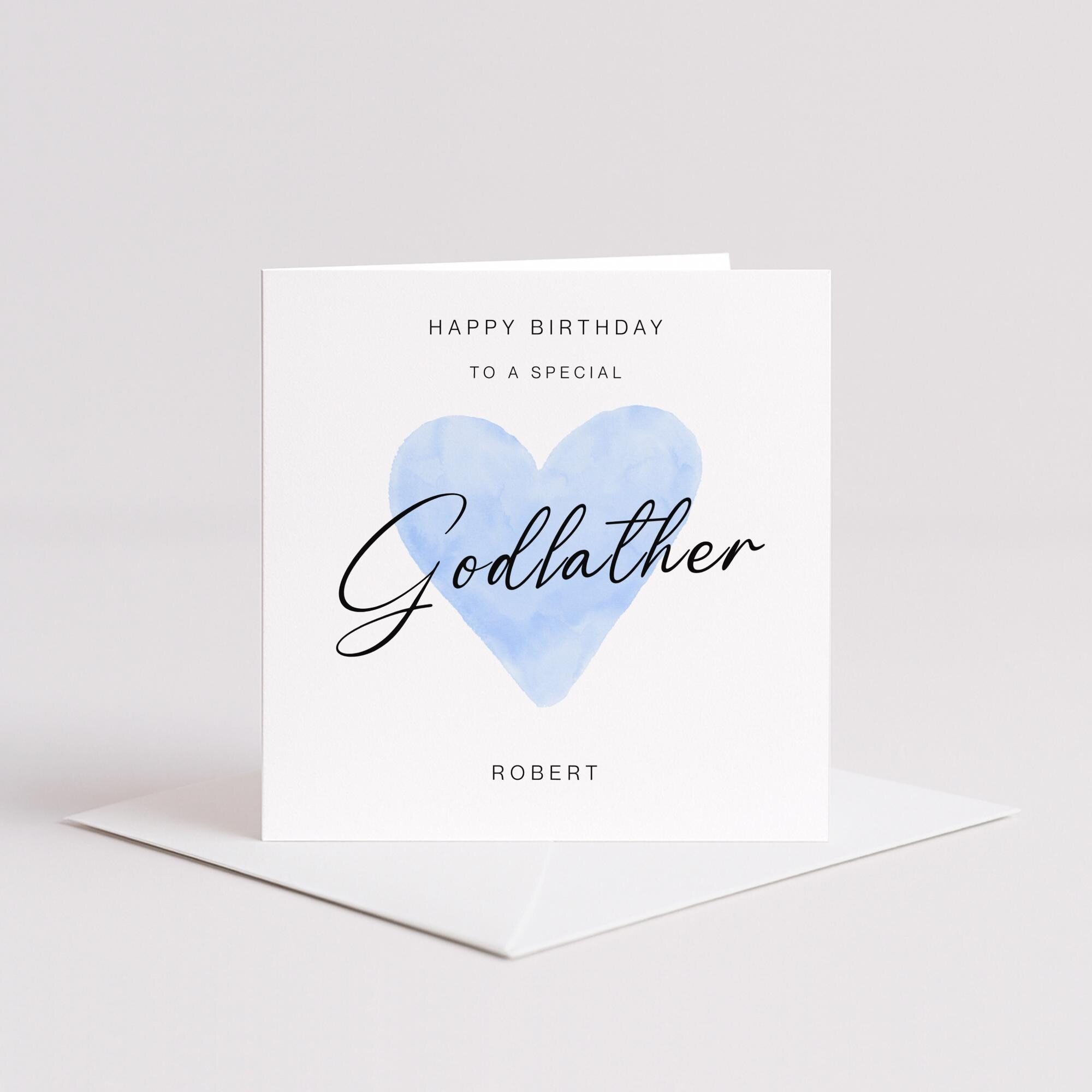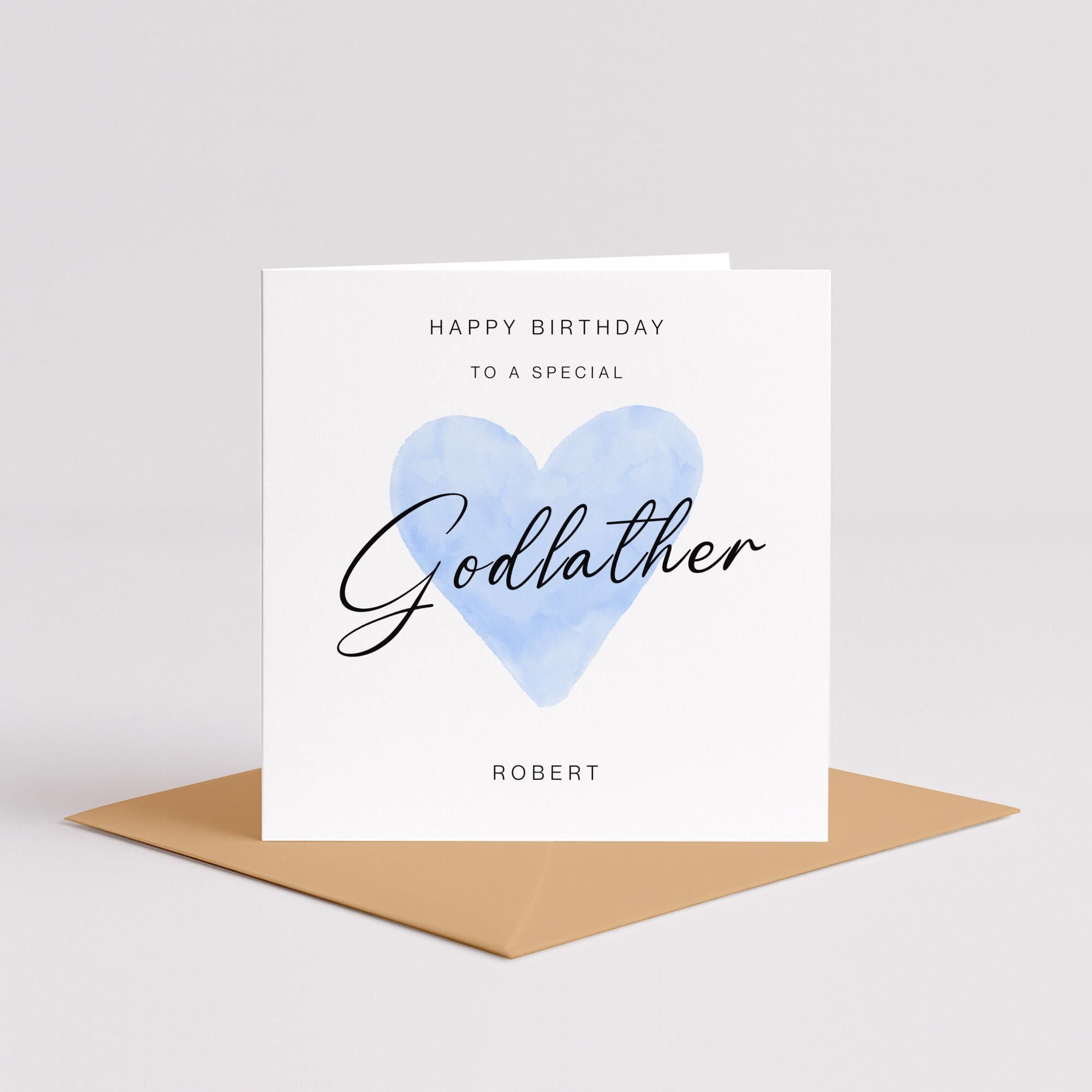 Godfather Birthday Card – Celebrate your godfather’s special day with this elegant handmade greeting card featuring a soft blue watercolour heart and graceful script. The design reads “Happy Birthday to a Special Godfather” and can be personalised with a name you choose, making it a truly thoughtful keepsake. Printed on premium smooth or textured cardstock and paired with a kraft or white envelope, this minimalist card is perfect for all ages and styles. It arrives blank inside for your own message or we can print one for you. Whether you're marking a milestone or simply showing appreciation, this card offers a warm and personal way to honour your godfather.
