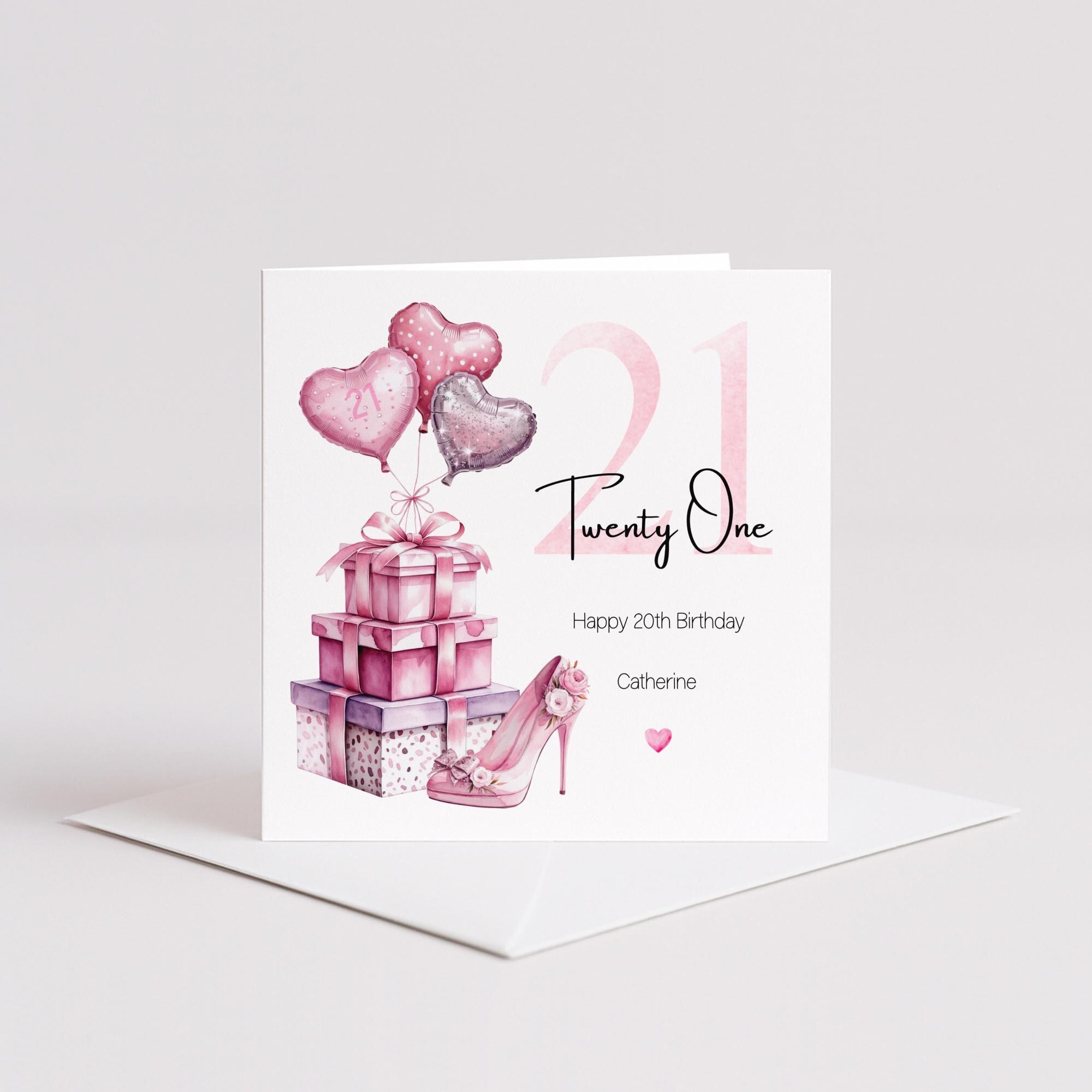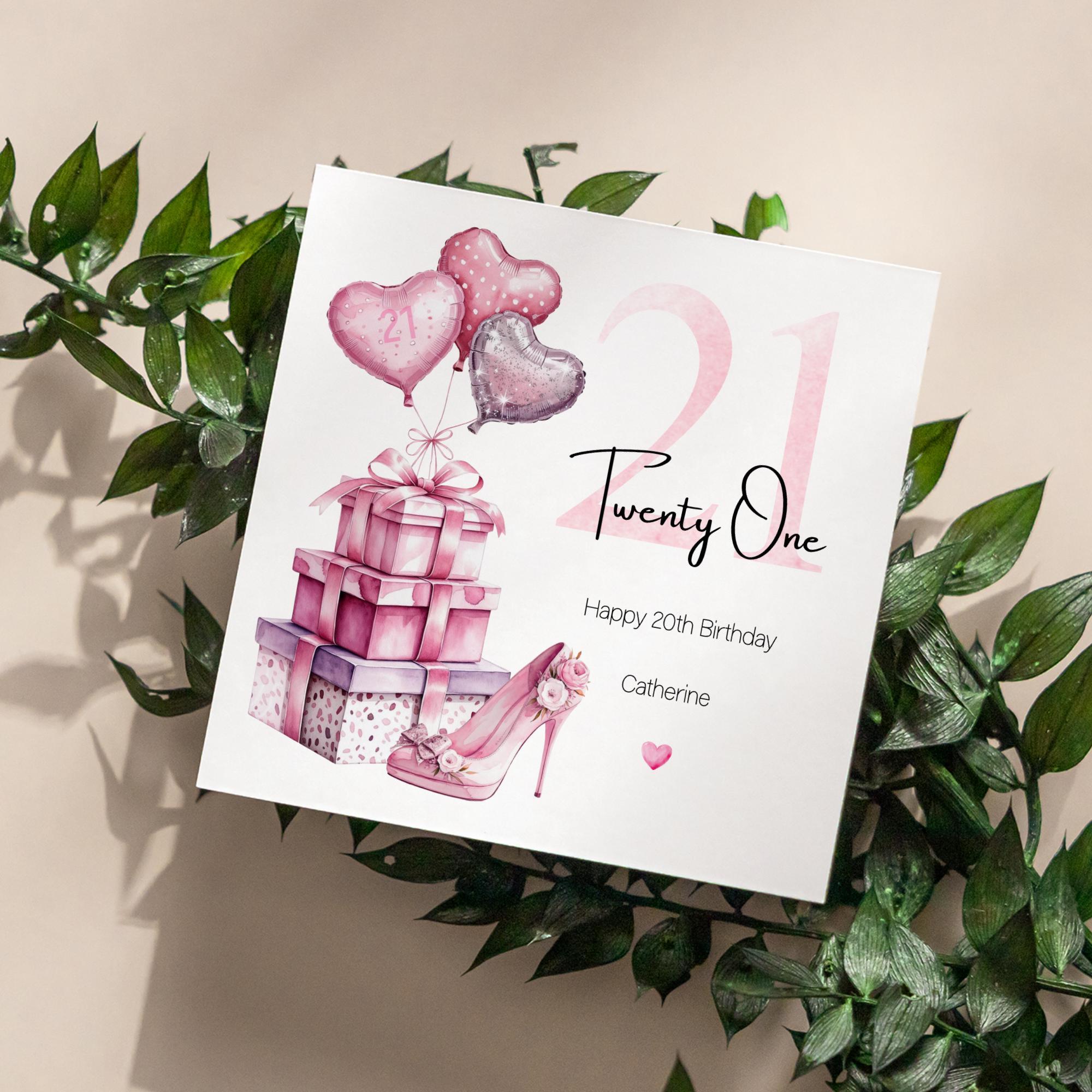 Personalised 21st Birthday Card for Her Pink Heels Balloons Gift Boxes Milestone Greeting Women