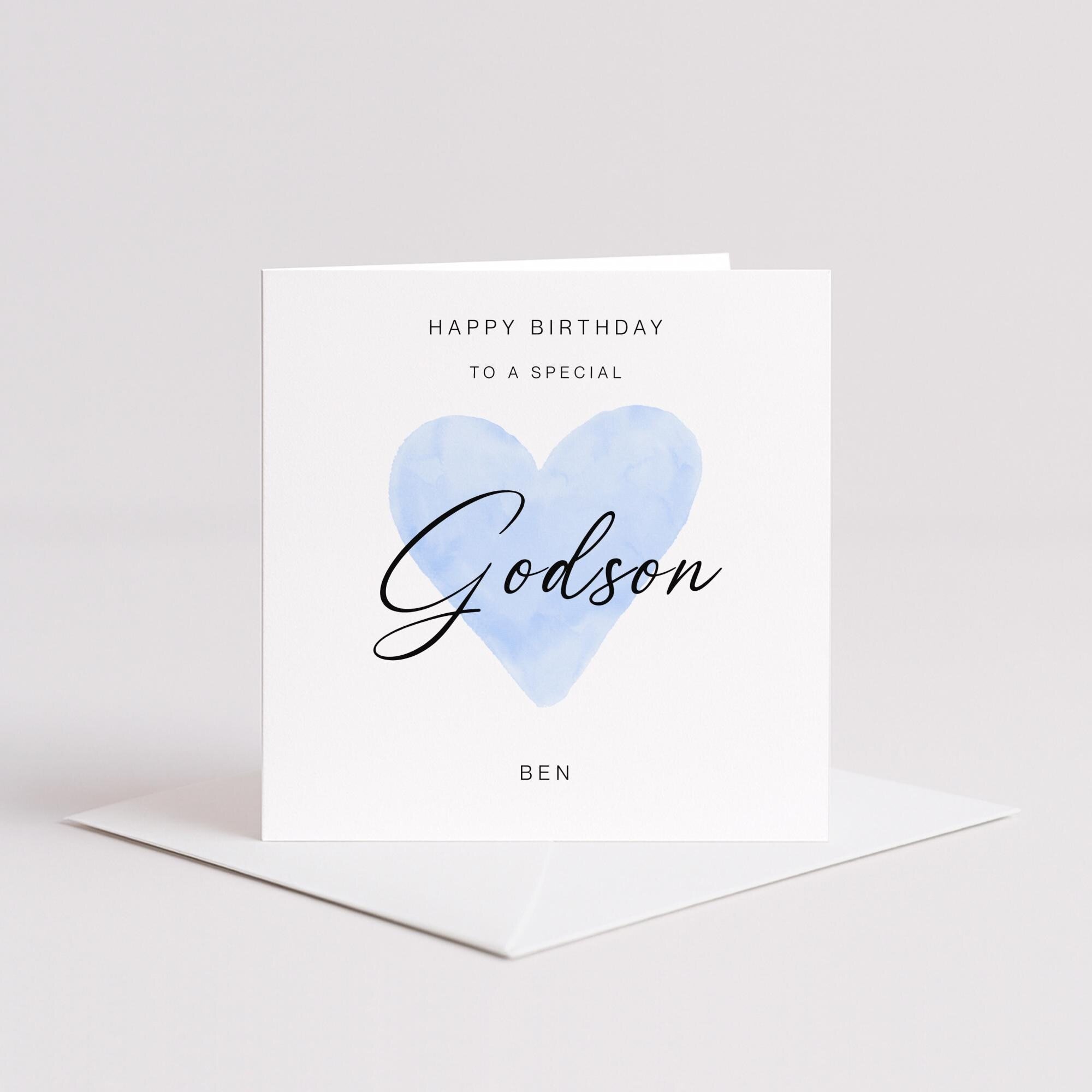 Celebrate your godsons birthday with this heartfelt handmade card, featuring a soft blue watercolour heart and graceful “Godson” script. The message “Happy Birthday to a Special” sits proudly above, while your chosen name appears below in bold uppercase for a personal touch. This clean, minimalist design is perfect for expressing love and appreciation from godparents to their godson. Printed on premium cardstock and made to order, it’s a timeless keepsake that blends elegance with emotional warmth—ideal for birthdays that deserve something truly special.