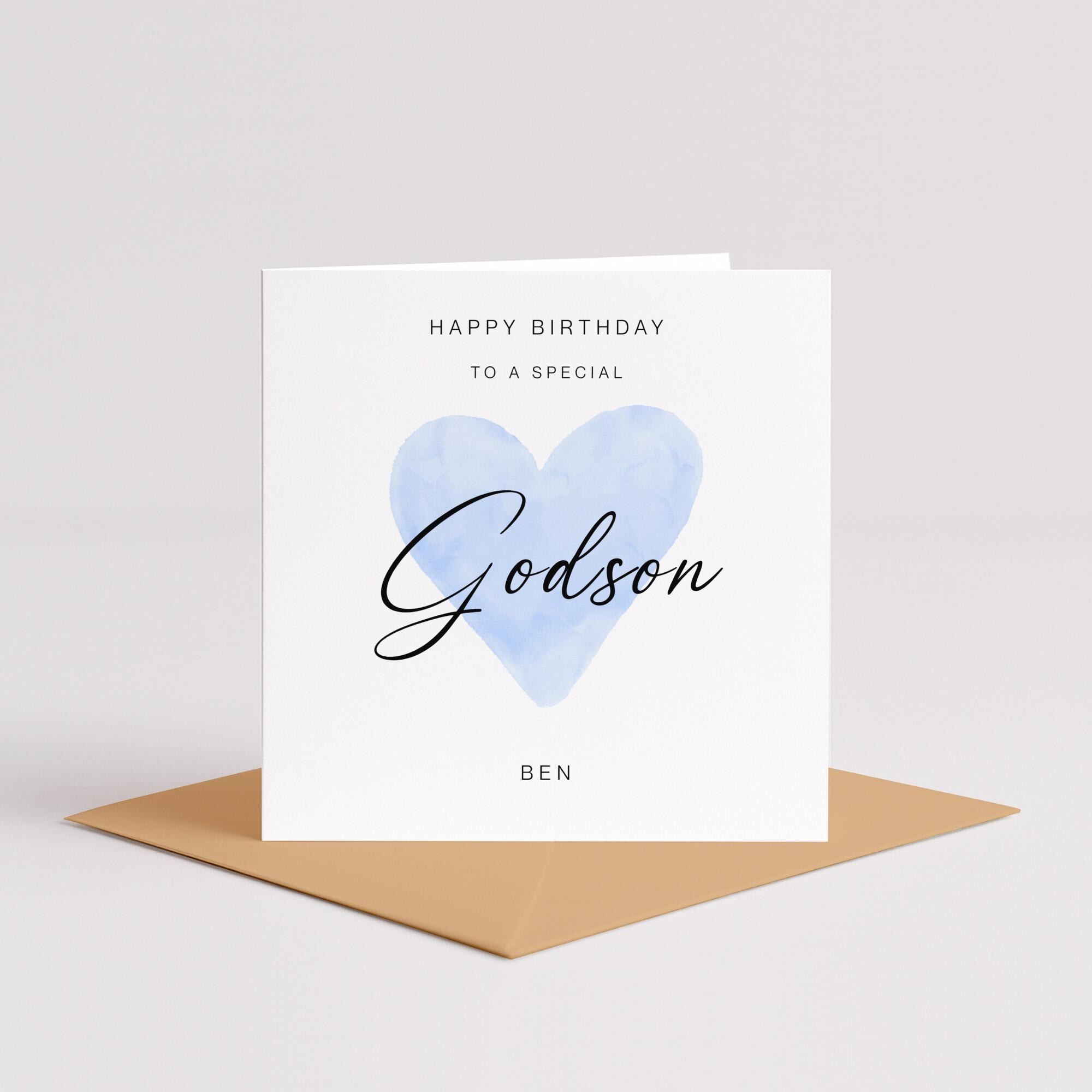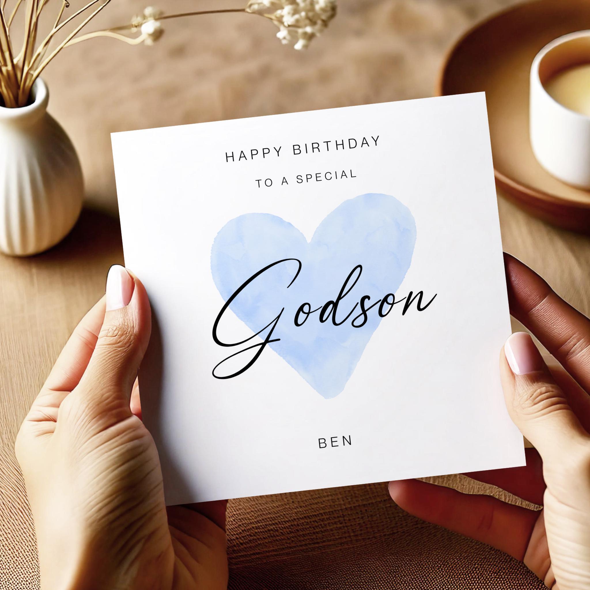 Godsons birthday card personalised blue heart design custom name handmade minimalist greeting