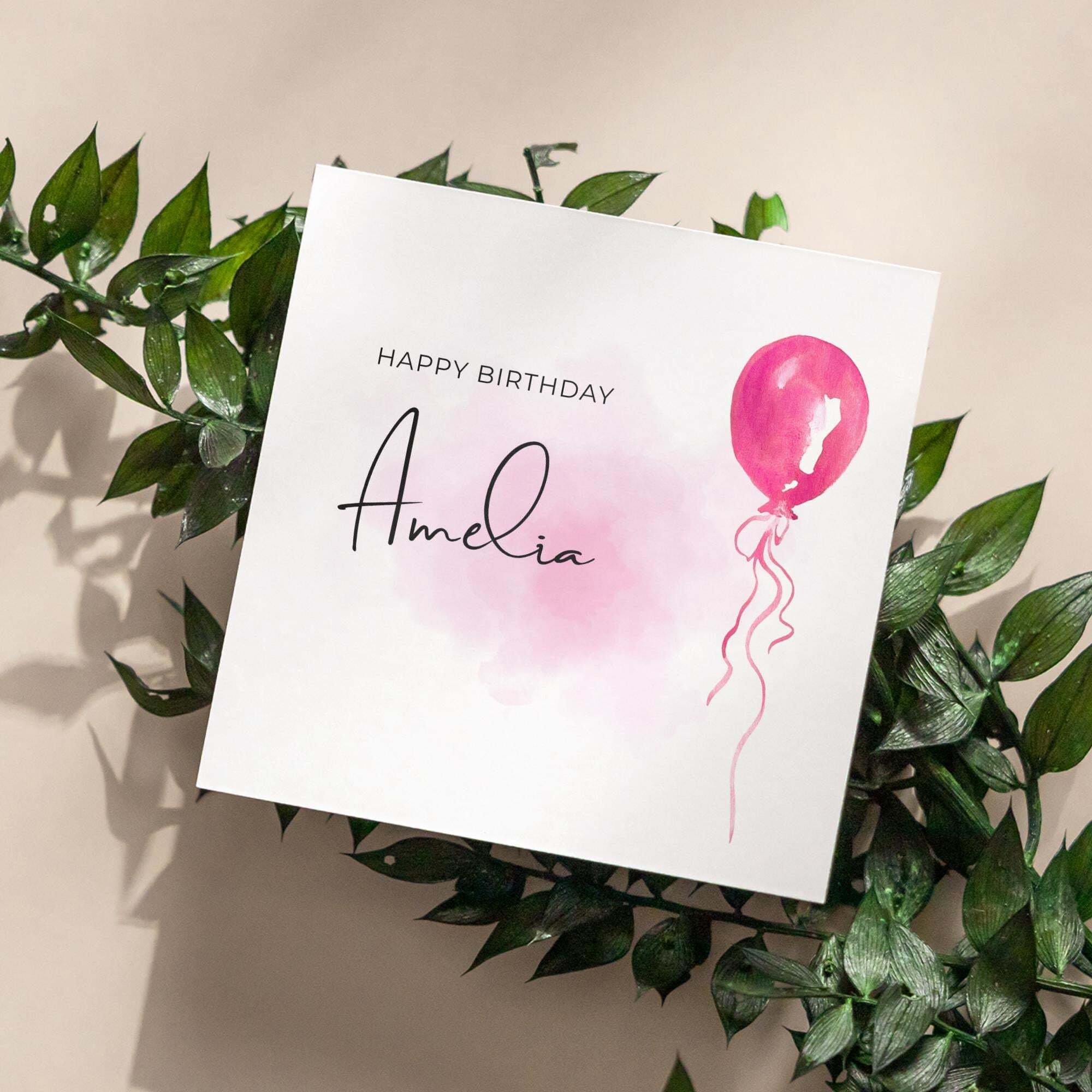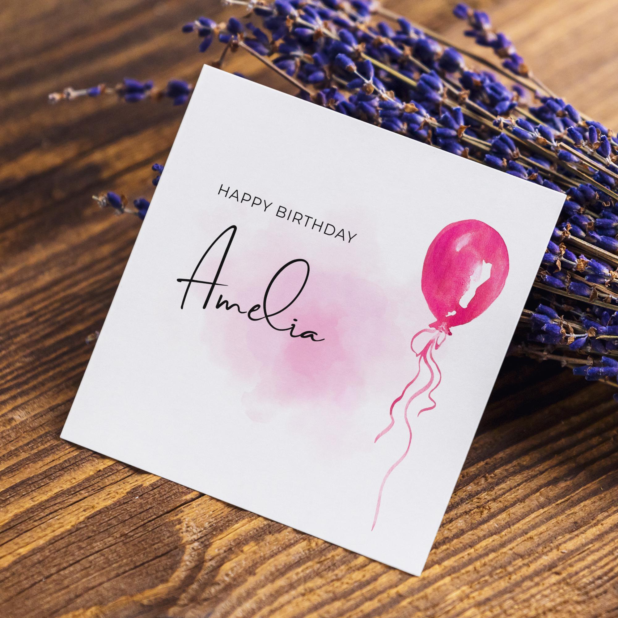 Pink balloon card personalised birthday design custom name script soft greeting
