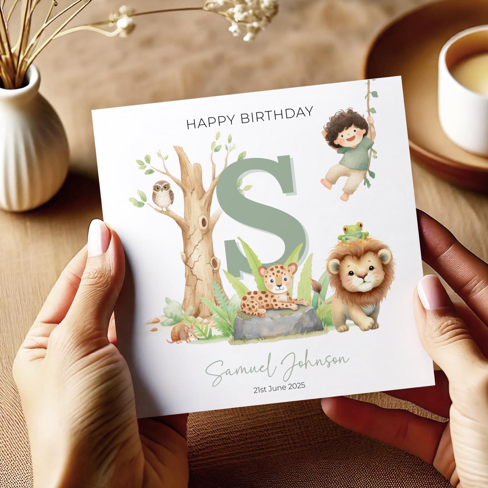 Personalised Jungle Birthday Card with Safari Animals & Child Name Custom Kids Greeting Handmade