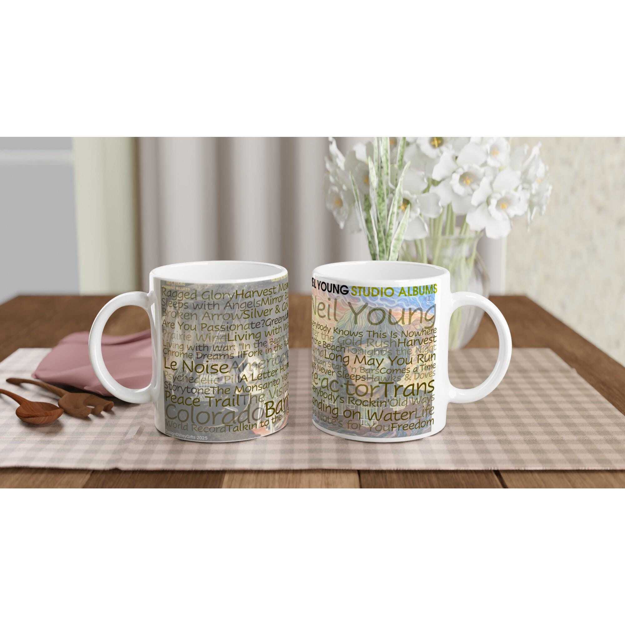 This mug lists all the 45 Studio Albums by Neil Young as listed on Wikipedia. The album cover on the front is his first album and the back is his latest. This ceramic mug is perfect for any event of the day especially listening to Neil Young music. Your coffee, chocolate, or tea will taste so much better. The mug is glossy white and the prints come out beautifully and vividly on it. The print retains its quality and lustre when used in both microwaves and the dishwasher.