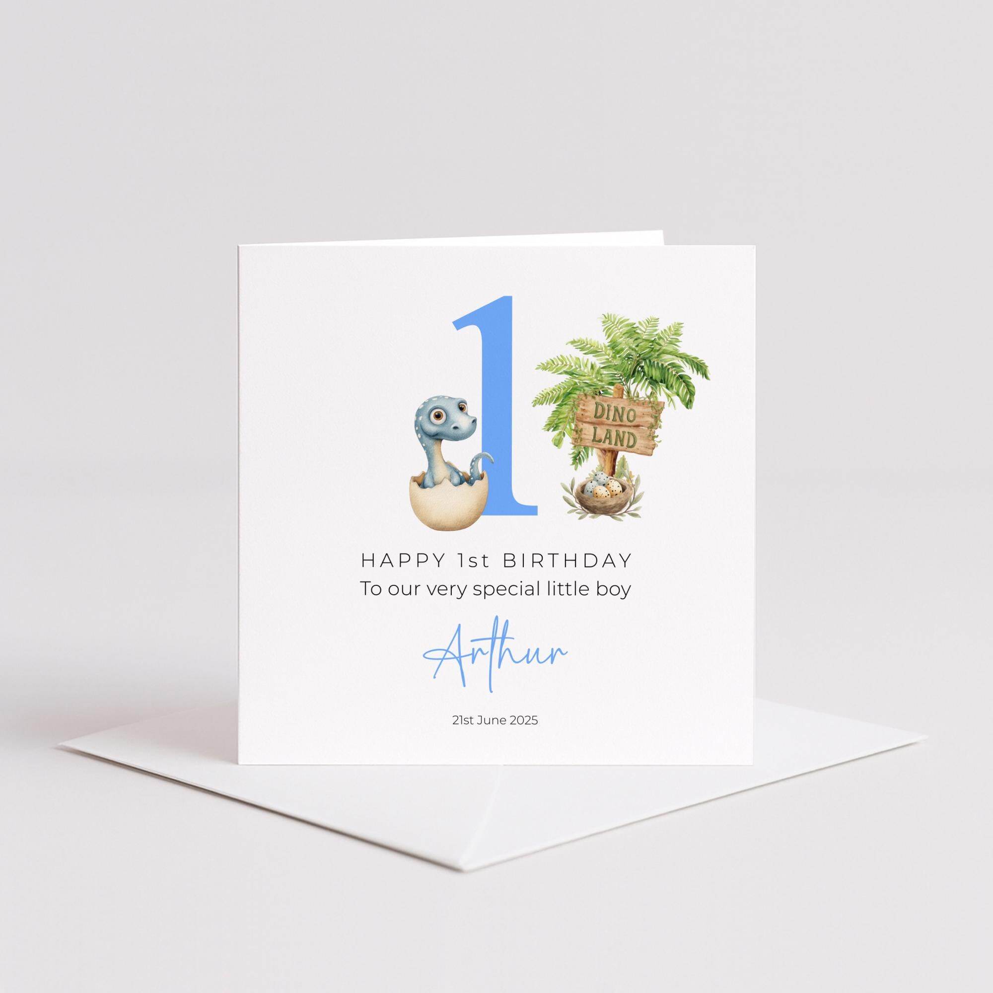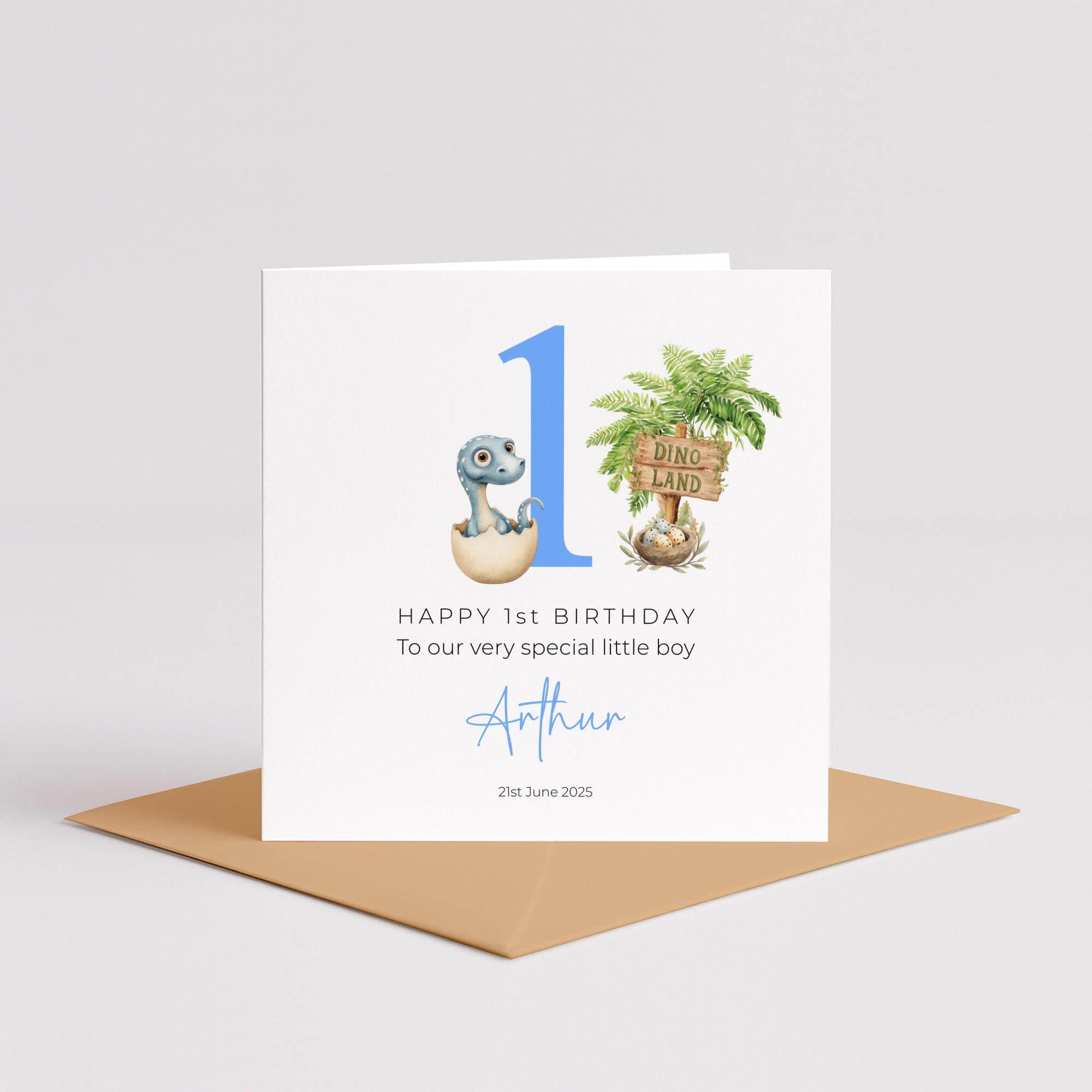 Celebrate your little one’s milestone with this personalised dinosaur-themed first birthday card, featuring a baby dinosaur hatching from an egg beside a bold blue number one. With tropical foliage, a Dino Land sign, and custom name and date such as Arthur and 21st June 2025, this charming design is perfect for dino-loving boys. Printed on smooth white cardstock and paired with a kraft envelope, the card is blank inside or can include a custom message. Sized at 150mm square when folded, it’s ideal for keepsakes, memory boxes, or themed parties. Each card is handmade.