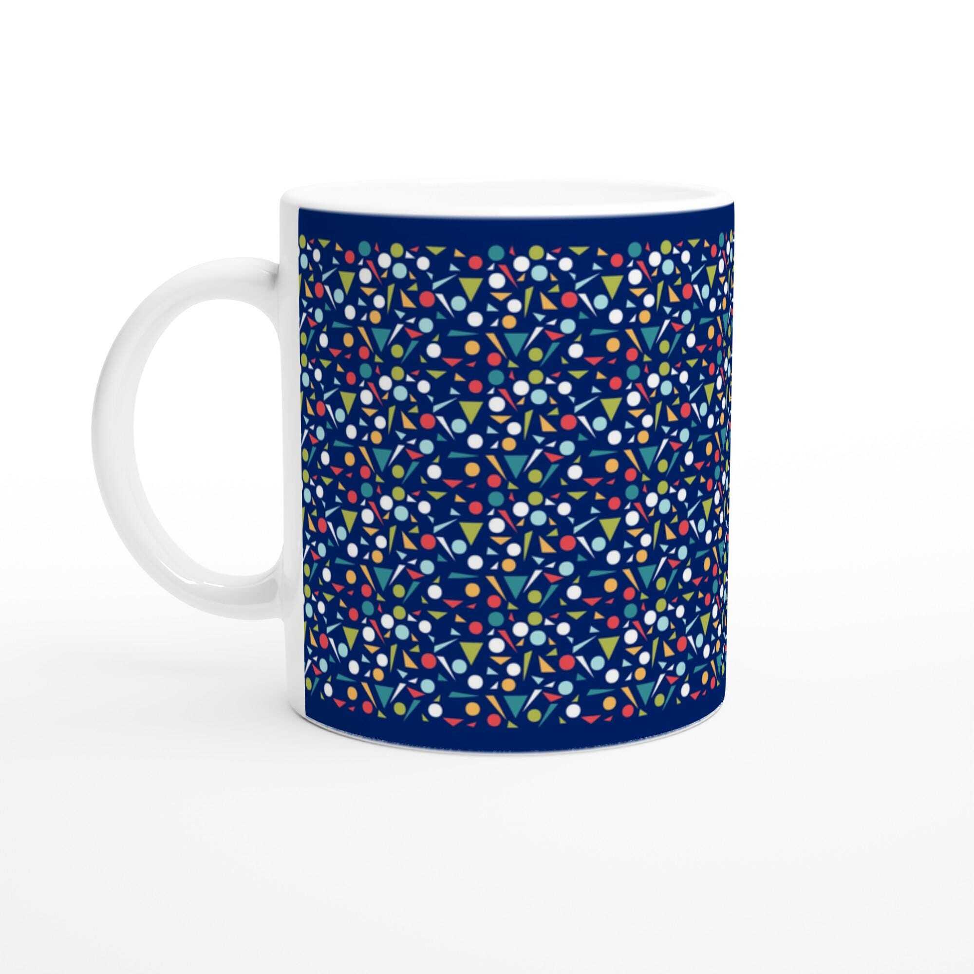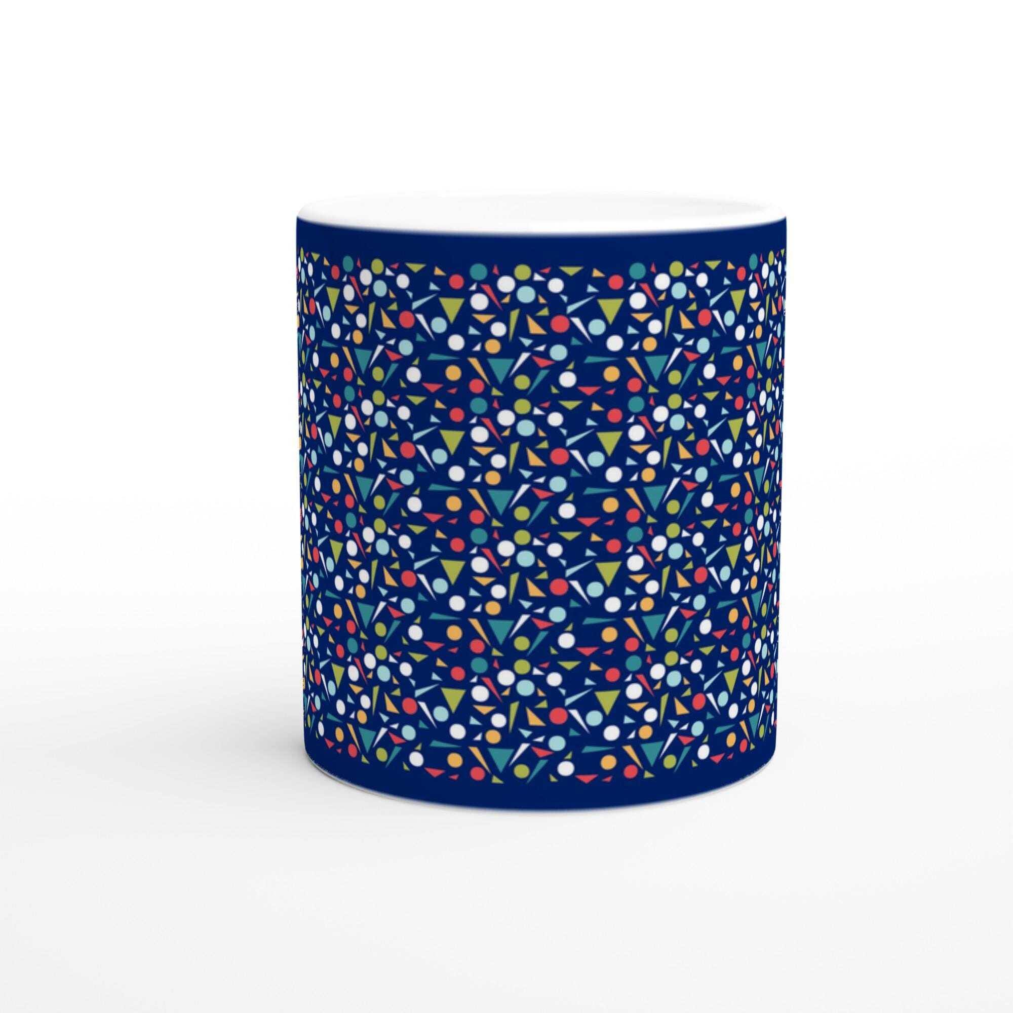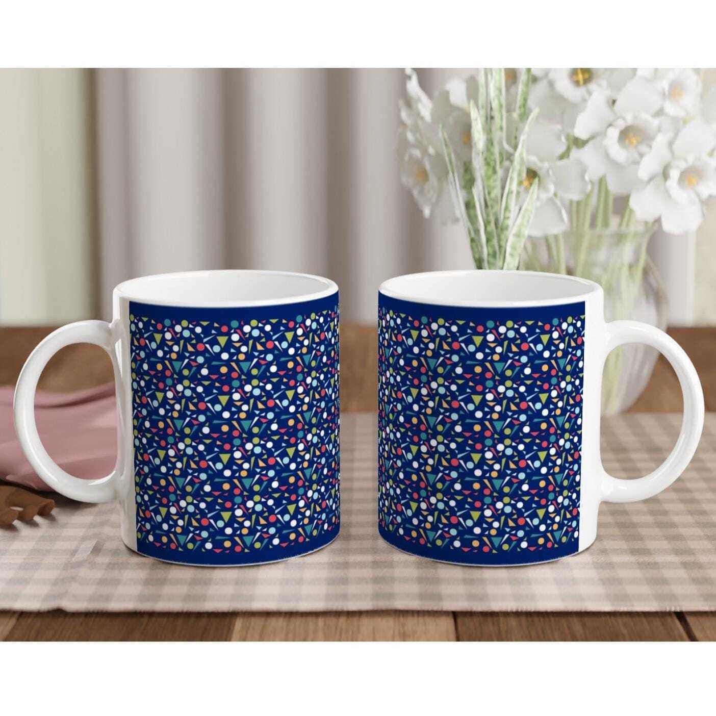 This beautiful Colour Triangles and Circles on Blue Ceramic Mug is perfect for any event of the day. Your morning coffee, a hot chocolate, or any other hot beverage you enjoy. The mug is glossy white with a colored rim, inside, and handle. The prints come out beautifully and vividly on it. The print retains its quality and lustre when used in both microwaves and the dishwasher.