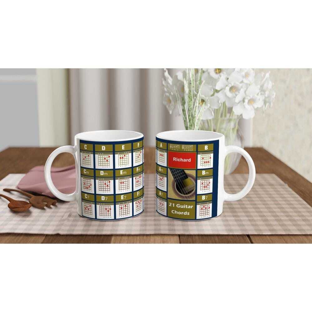 Why not personalise a Mug for someone learning their first 21 guitar chords. It will make drinking while learning the basic chords easier. Their morning coffee, tea or hot chocolate, will taste much better as they practise. The mug is glossy white or with a blue coloured rim, inside, and handle. The print comes out beautifully and vividly on it. The print retains its quality and lustre when used in microwaves and dishwashers.