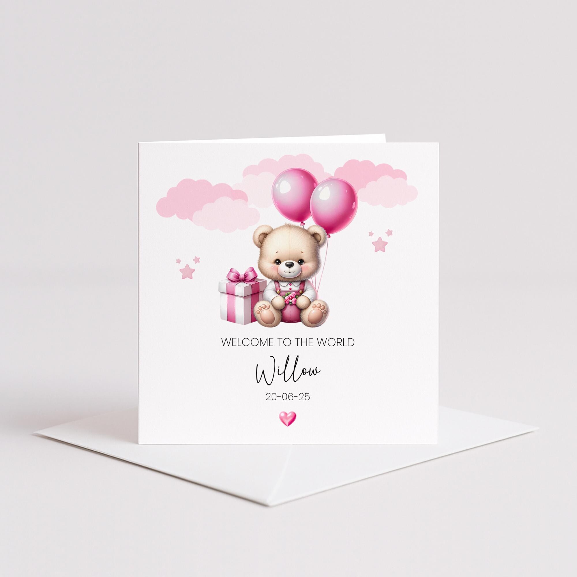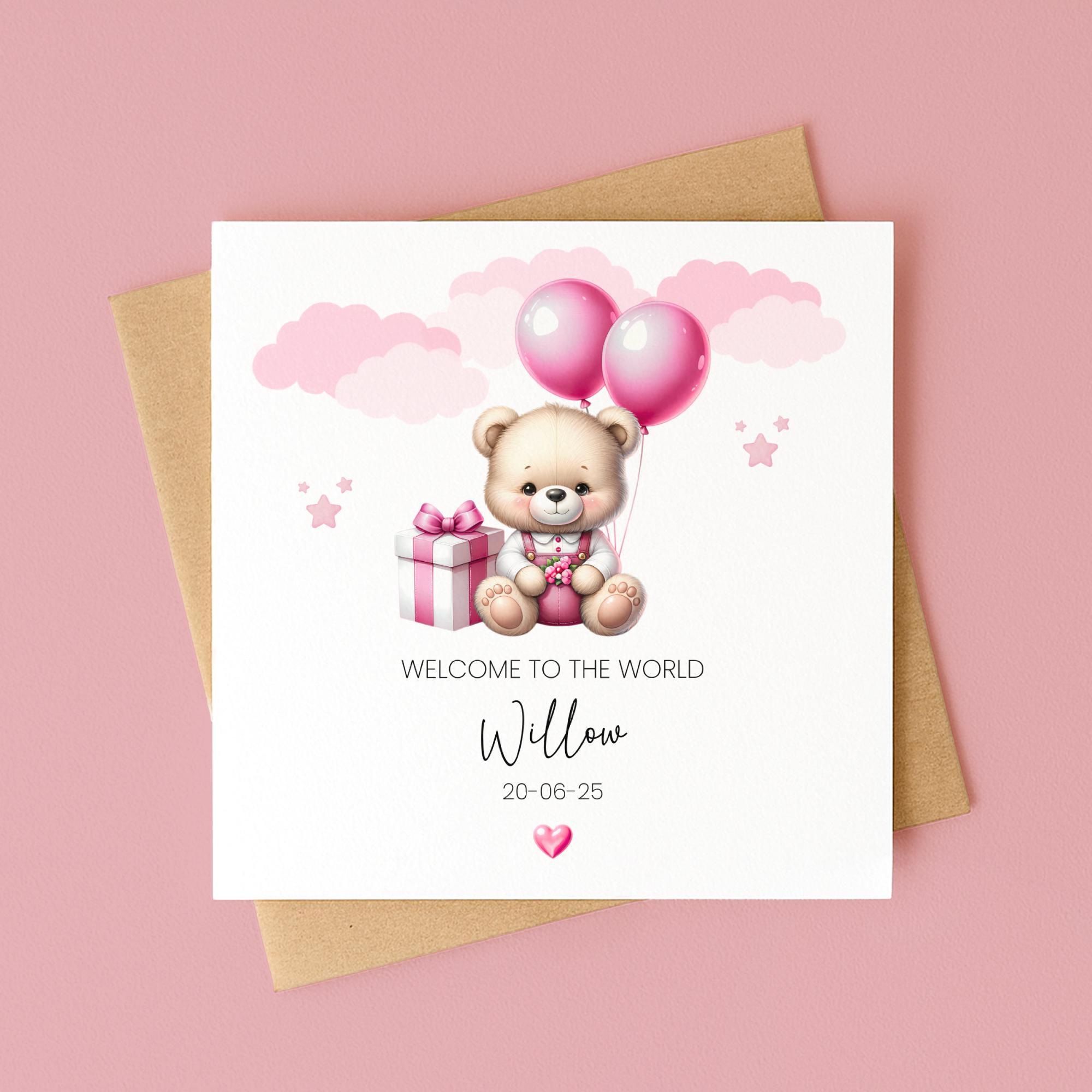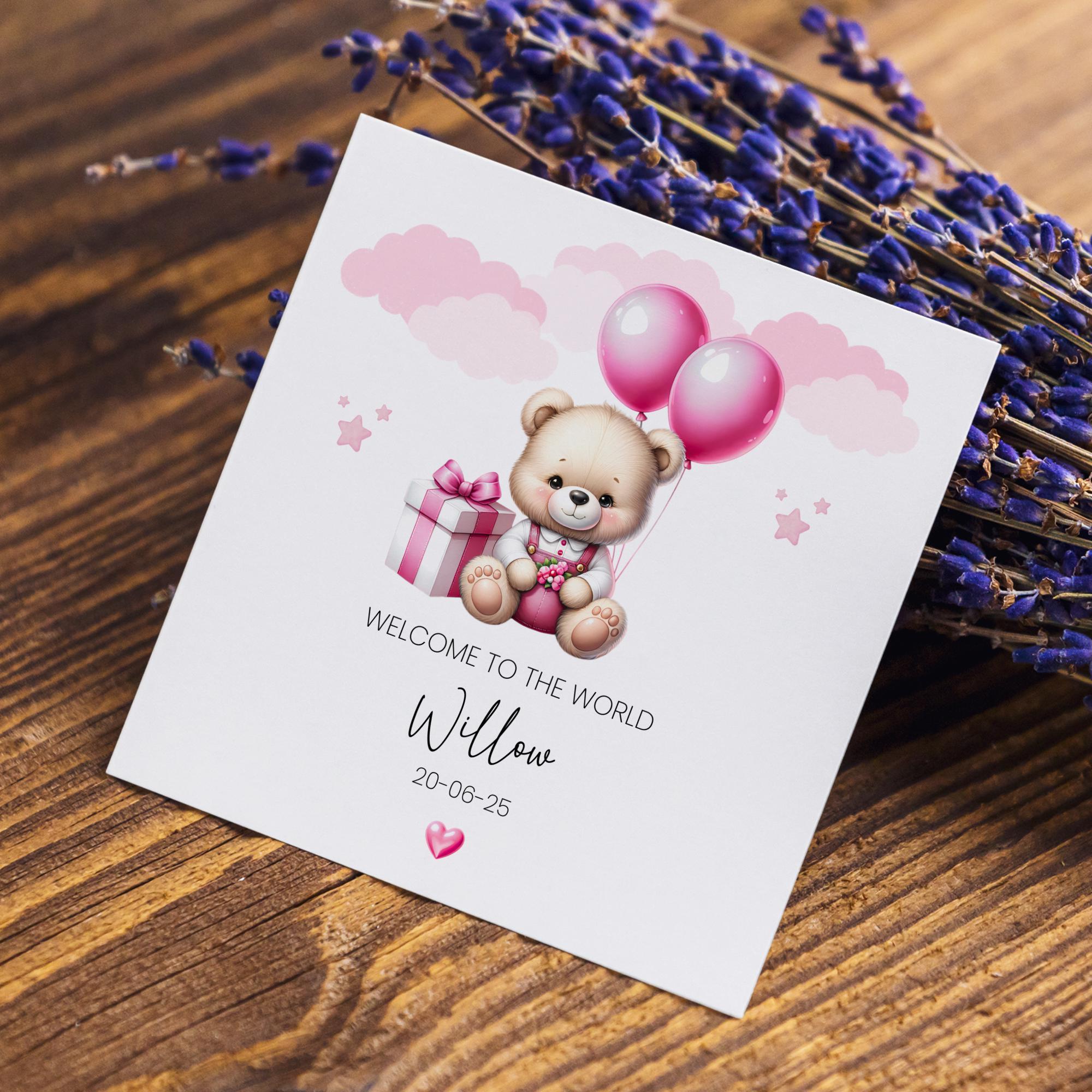 Personalised New Born Baby Girl Card Teddy Bear Birth Announcement Pink Balloons Keepsake